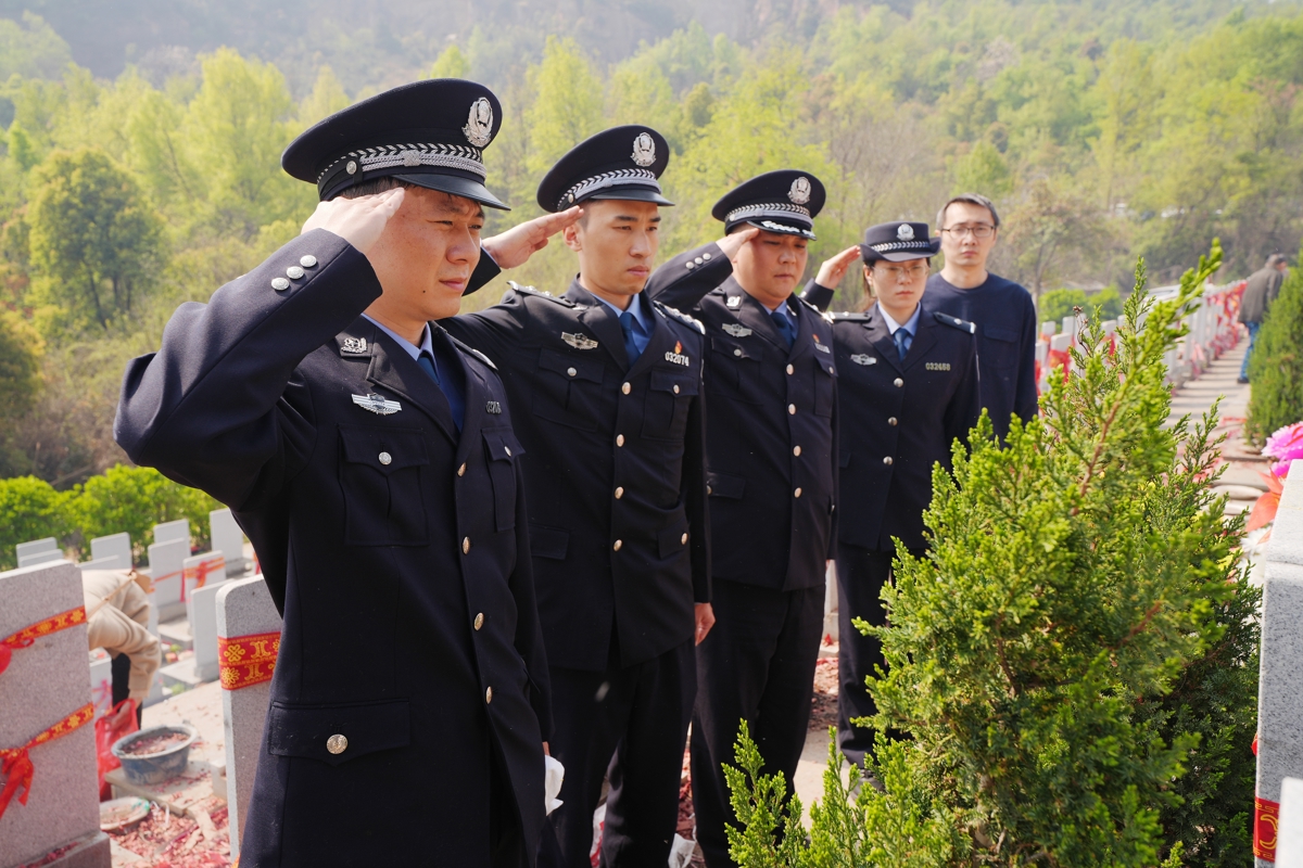 4月1日上午,在武汉市花山纪念公园,鄂靖佩戴父亲鄂红兵生前使用的警号,来给父亲扫墓。鄂靖和同事们一起在墓前敬献了鲜花,整齐列队,向鄂红兵敬礼。
