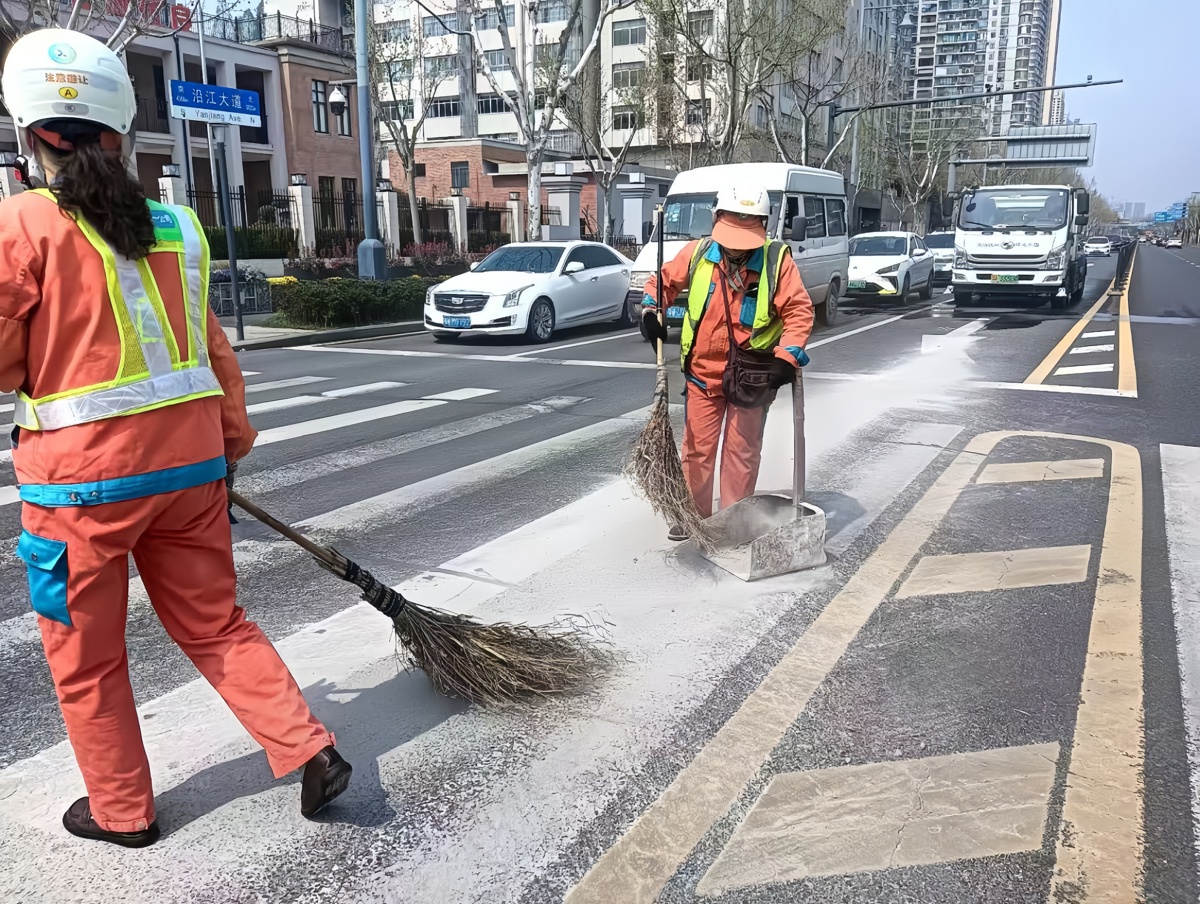 事故发生后,江岸环卫集团快速响应,迅速调集40余名环卫作业人员赶往现场紧急处置。环卫工人们手持铁锹和扫帚,沿路将散落的混凝土进行归堆清扫,洗扫车紧随其后,开启高压水枪对路面进行收尾冲洗,将残留的沙砾彻底清理干净。
