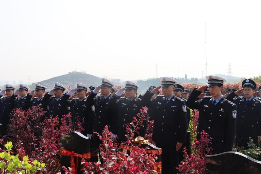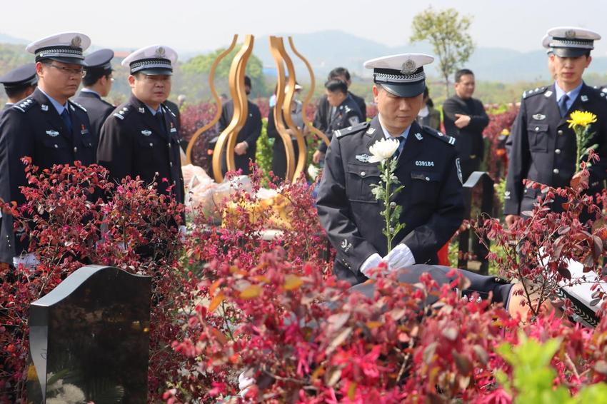 随后,民警辅警来到幸福山公墓里因公牺牲战友蒋仲超的墓碑前整齐肃立,敬献花篮,并举行追思仪式。青年民警代表、蒋仲超生前战友陈吉表示,告慰英雄最好的方式,就是成为像他一样的人。网安大队民警韩照代表全体新警庄严承诺:“我们必将继承英雄遗志勇毅前行,以青春担责任,以热血践使命,让蒋仲超同志的精神代代相传,为公安事业奉献全部青春与力量!”