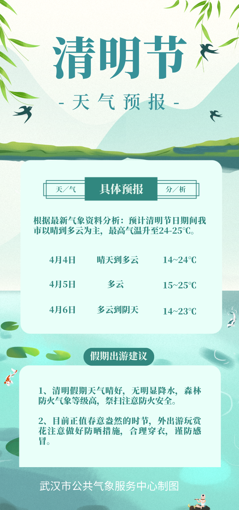 预计我市清明假期(4月4日至6日)以晴到多云为主,最高气温升至24~25℃,8日至10日有一次降雨过程。
