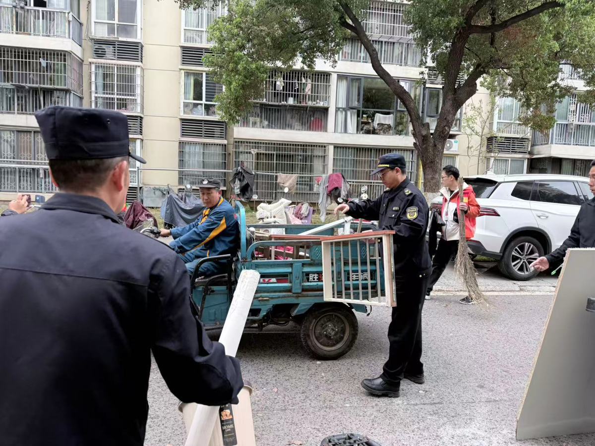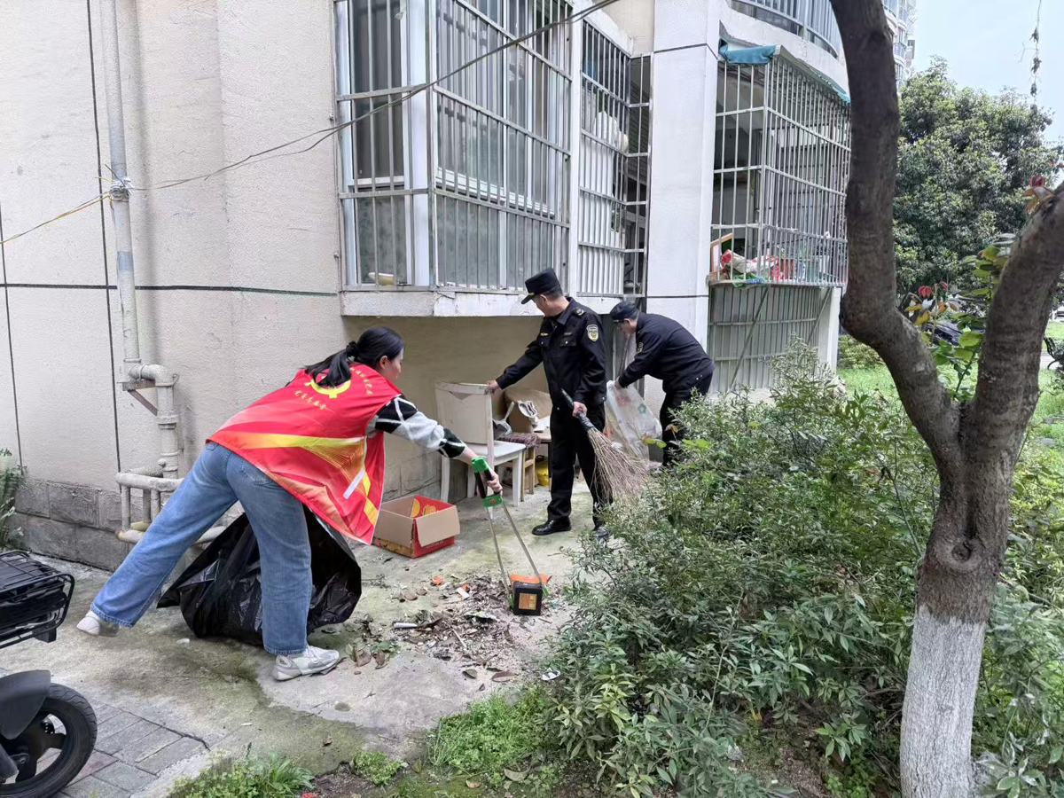 此次行动将整治重心延伸至居民“家门口”。各社区驻点城管队员联合物业、志愿者,对小区广场、绿地、楼道、停车棚等公共区域展开地毯式排查。大家手持扫帚、钳子、铲子等工具,分工合作,重点清理楼道内乱堆乱放的旧家具、纸箱杂物,铲除墙面“牛皮癣”,清扫绿化带内积存的落叶、白色垃圾和烟头。针对小区内外长期存在的卫生死角,行动组集中攻坚,彻底清除积存垃圾和废弃杂物,畅通消防通道,消除安全隐患。