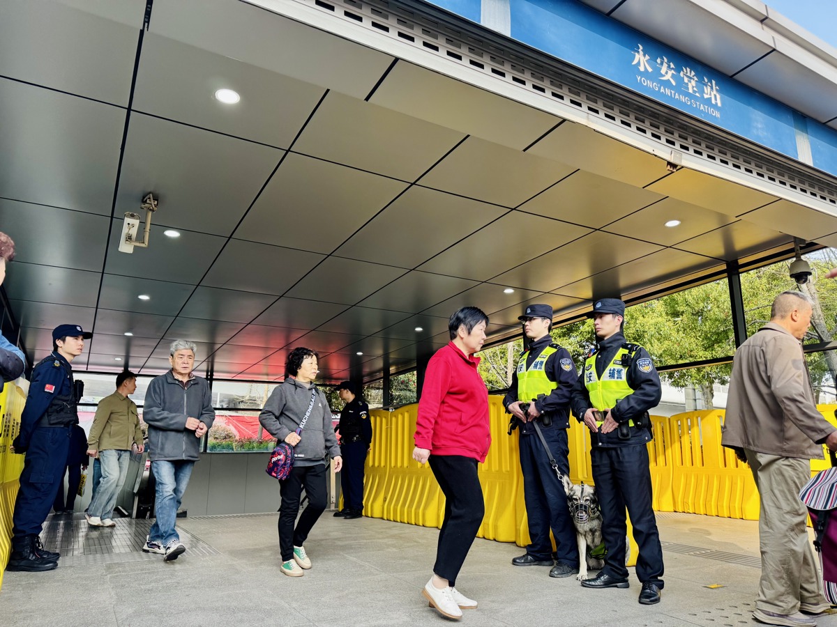 4月3日15时许,置身永安堂地铁站可以看到,站厅、出口通道都已设置蓝底白字的指引标志。伴随着一趟趟列车到站,地铁站迎来一波客流小高峰。警灯闪烁之处,民警魏丽莎正带队在站内巡逻。