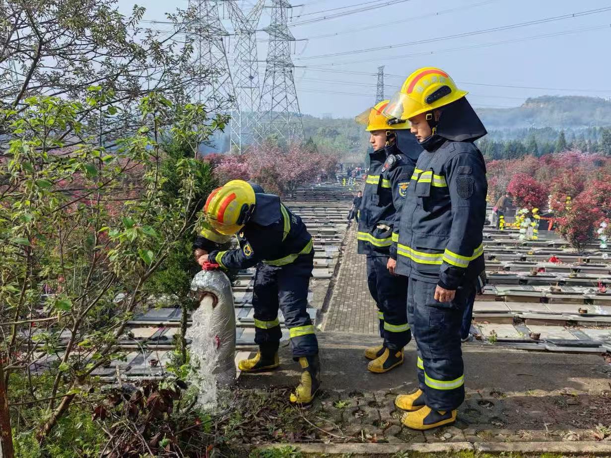 为预防户外植被火灾,巡防及前置驻防期间,重点对墓地周边及林缘结合部开展喷水增湿作业,构建物理防护屏障。此外,综合运用无人机巡航、红外监测等技术手段实现火情动态预警,确保遇有警情能够迅速、准确地做出反应。