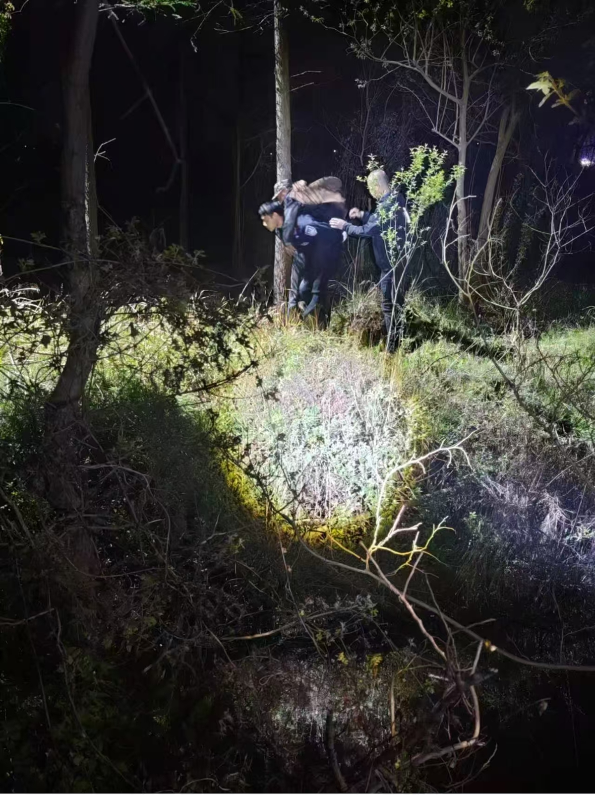 “找到了!快跟上!”李智和高东拎起装备就往林子里赶。荆棘丛生、路面崎岖,两人打着手电深一脚浅一脚往里走,果然在草丛中发现了蜷缩着的王爹爹。李智蹲下身,稳稳把老人背到身上,小心朝林外走。