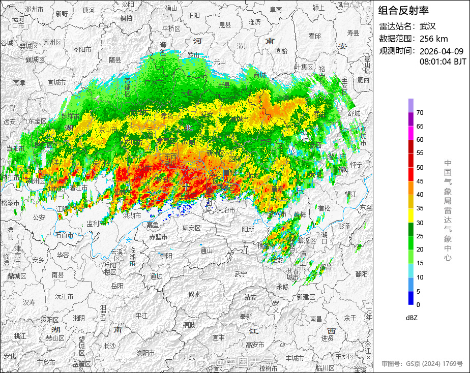 据中国天气网:截至今早7时,武汉降雨量64.2毫米,已达暴雨量级。目前降雨仍在持续,雷达回波图上看,武汉上空对流明显,雨势较强。