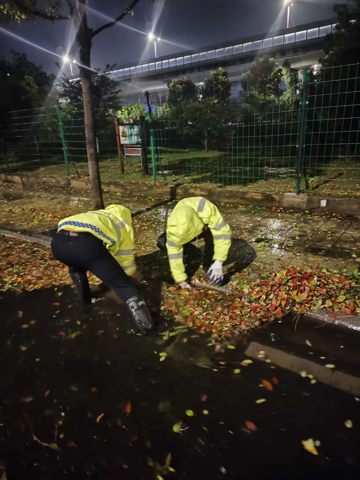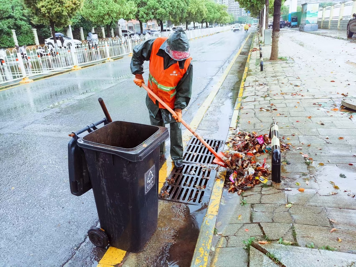 江汉区采取“定点值守+动态巡查”模式,980名环卫工人雨中坚守,对132个短时积水点位实施“人工清掏+机械疏通”快速处置,累计疏通排水口320处。