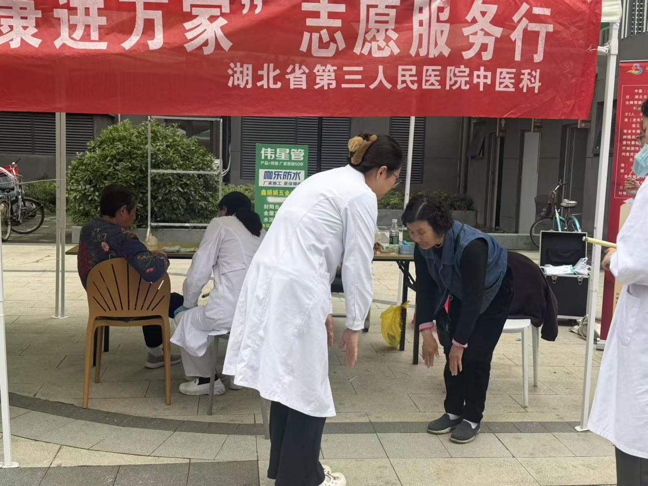 为传承中医文化精髓,普及中医诊疗知识,切实将优质中医医疗服务送到群众“家门口”,解决社区居民尤其是老年群体的健康困扰,近日,武汉市第三人民医院中医科组织骨干医师团队,走进长江新区兴谌社区新城盛景小区,以传统中医治疗手法为居民送上健康关怀,赢得了社区居民的广泛赞誉和热烈喜爱。