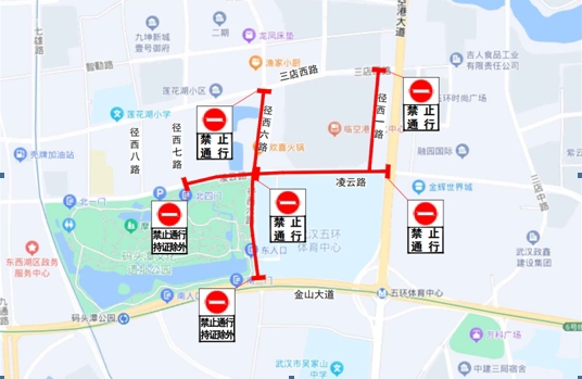 1.武汉五环体育中心区域禁止机动车通行,除持证车辆外(即金山大道——临空港大道——三店西路——径西七路——凌云路——径西六路——金山大道的合围区域内)。