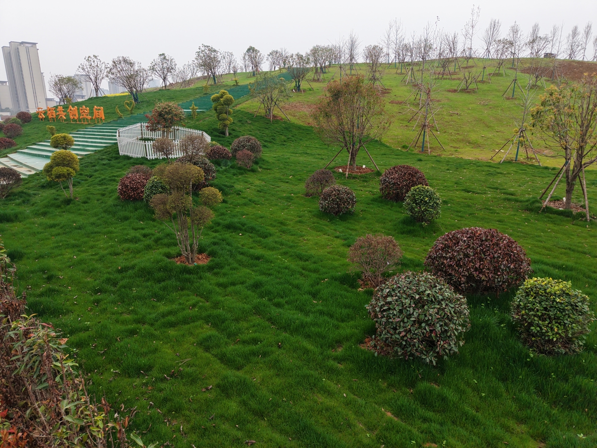 顺着云栖共创空间步梯,拾级而上,坡上栽种了桂花树等多种树木,树下绿茵茵的草地,透出春的气息。步入22米海拔的坡顶,10亩的共享菜园映入眼帘。金香说,去年12月前,这里还是杂乱的闲置地块,如今坡上坡下,植物种草,成为休闲公园。