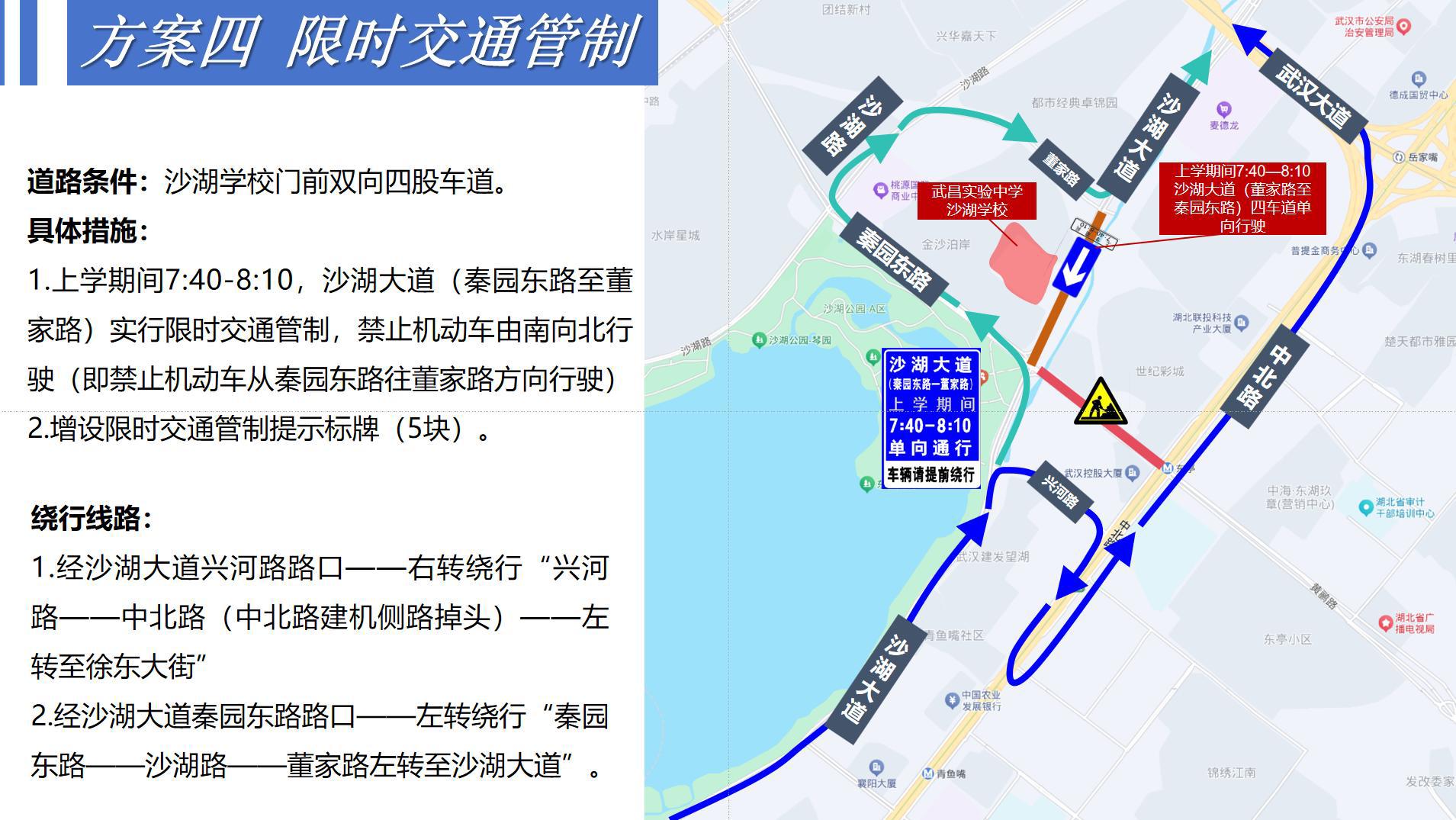 武昌交警重整思路、拓展视野,在反复模拟、研究车流走向后,敲定提出“早高峰主干道限时单行”的突破性方案。上学时段每日7:40-8:10,将沙湖大道(董家路至秦园东路段)由双向通行调整为北向南单向通行,北向南车道由原来的2车道增加为4车道,并同步规划两条绕行线路,兼顾送学效率与社会车辆通行。
