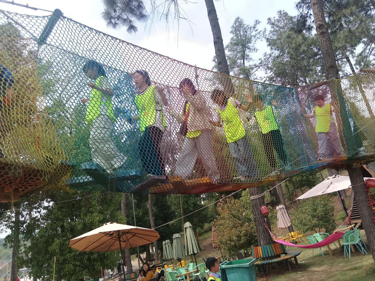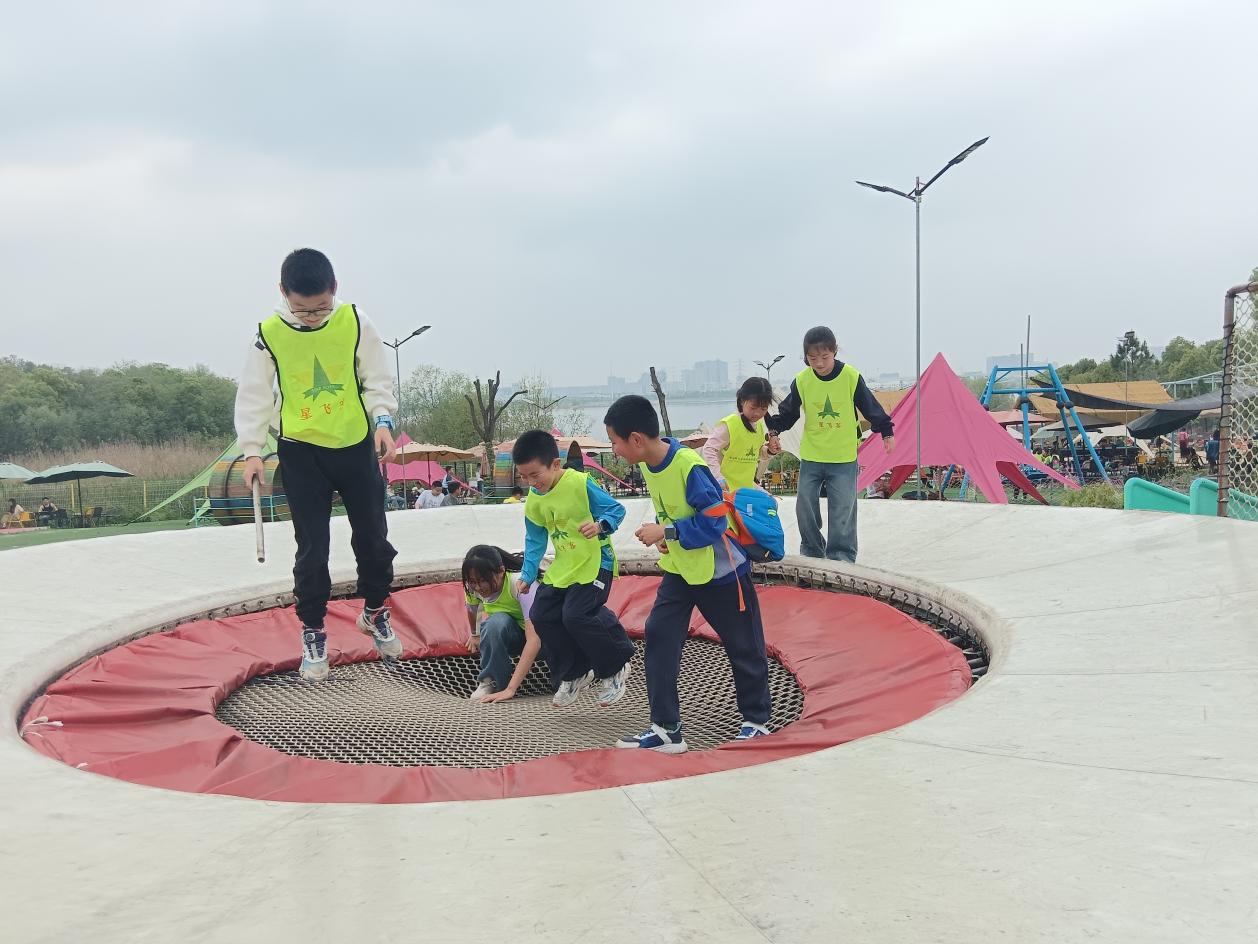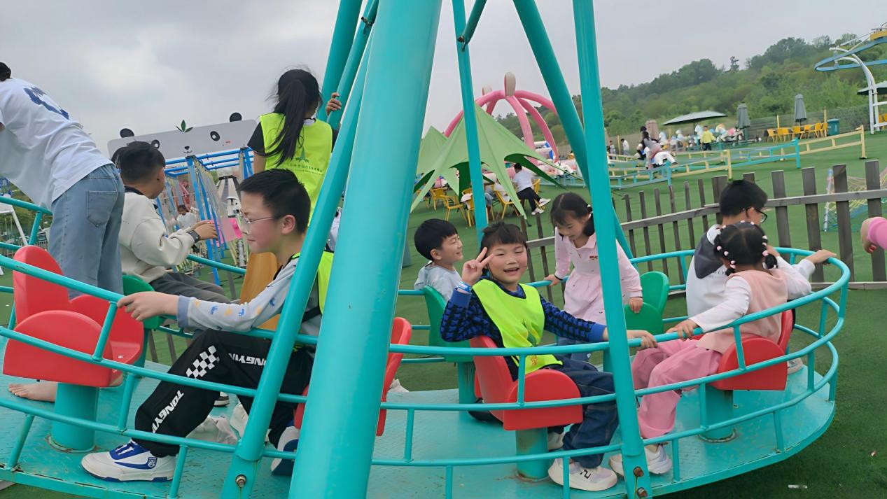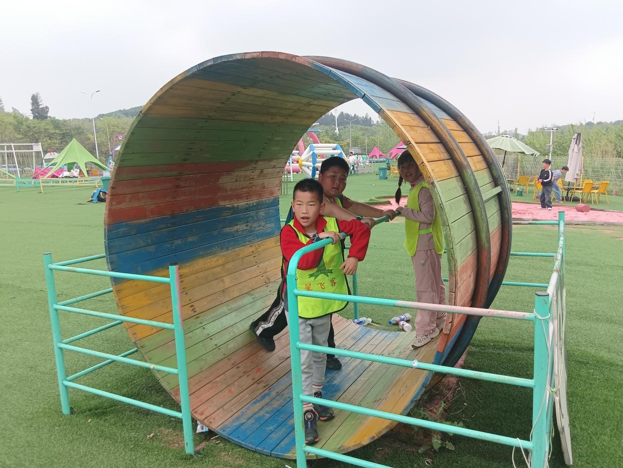 午餐后短暂休息,“乐园闯关大冒险”正式上演。孩子们欢呼着冲进红色小象乐园,这里宛如一座彩色童话王国:丛林穿越区绳网高挂、木桥摇晃,大家互相打气,一步步突破胆怯;“滑梯大冲刺”人气爆棚,从红色滑梯一冲而下时,尖叫声与笑声此起彼伏;“蹦蹦云朵床”上,孩子们像弹簧般蹦跳不停,比谁跳得更高更稳;彩色滚筒项目需要多人配合,钻进滚筒向前翻滚时,若默契不足便会东倒西歪,逗得围观伙伴哈哈大笑。孩子们三人一队、五人一组,有的加油鼓劲,有的示范指导,有的伸手牵起胆小的同伴。“那个摇摆木桩我一开始根本不敢走,是好朋友牵着我一步步过去的,后来我自己也能走完啦!”任晨宇擦着汗,眼睛笑成了一条缝。