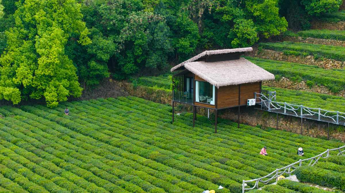在大军山茶园,茶树枝繁叶茂,芽叶饱满油亮,色泽由嫩绿转为深绿,香气沉稳馥郁。这片茶园由两山(上海)旅游发展有限公司负责运营,该公司总经理南境介绍,大军山茶园是大军山综合体的首开项目,它不止是一片茶园,更是一个以茶为媒、融合自然疗愈、山地户外、民宿、沉浸式体验的复合型文旅目的地。