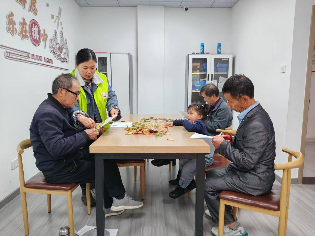 过程中,老人们互相交流、互帮互助,小朋友在一旁好奇参与、传递材料,活动室里充满了欢声笑语。大家不仅在手工创作中锻炼了动手能力,舒缓了心情,更在邻里互动中收获了温暖与快乐,一张张完成的作品,既承载着老人们对生活的美好期许,也定格了社区温馨的互动氛围。