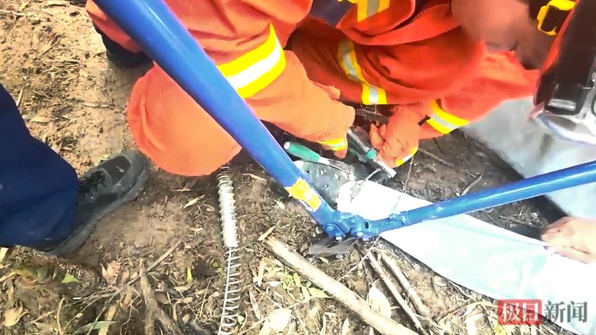 为保障救援安全,消防员首先对周边区域展开地毯式排查,清理附近残留隐患。随后,民警一边安抚被困男子的情绪,一边仔细查看捕兽夹的结构。起初,消防员尝试用液压剪切钳和老虎钳剪断连接捕兽夹的钢丝索,但因捕兽夹弹簧机构受力敏感,稍有触动便会应激收紧,不仅无法有效破拆,反而加剧了男子的痛苦。