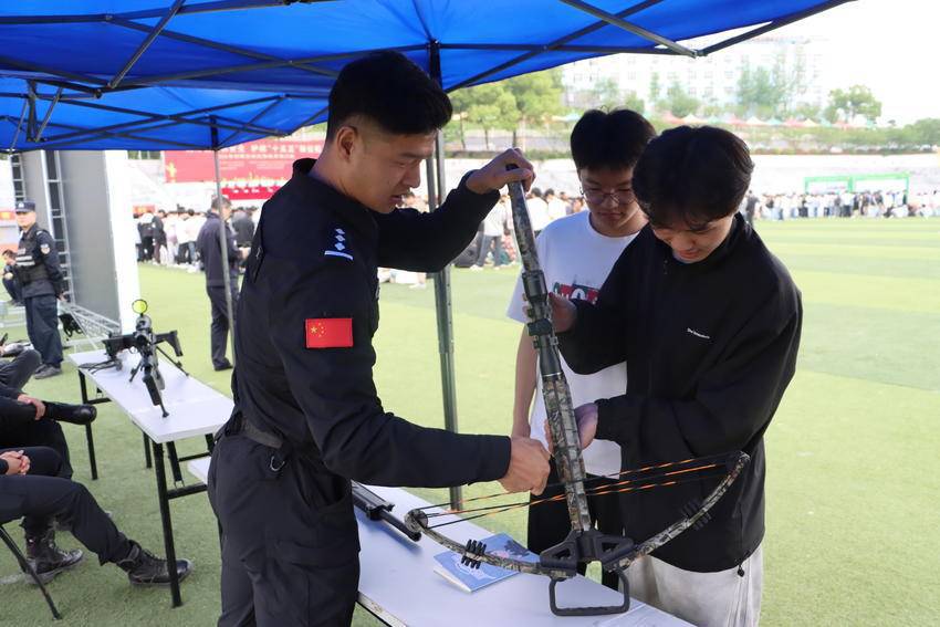 特警装备展示区前,一名男生主动上前,试着扛起狙击步枪,刚一发力就忍不住喊出声:“这也太沉了吧!原来特警平时执勤这么辛苦,真的太不容易了!”周围的同学纷纷掏出手机,记录下这一瞬间。