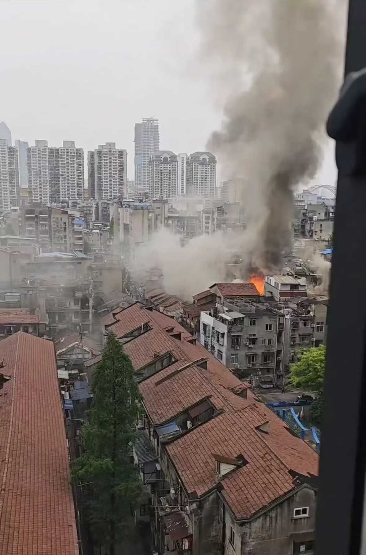 4月15日中午,有网友称,武汉市硚口区长堤街一处居民楼发生火灾。画面显示,居民楼楼顶燃起熊熊大火,现场浓烟滚滚。