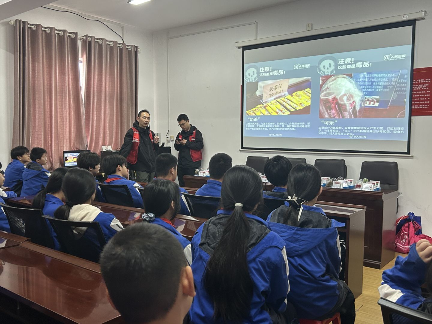 活动现场,社区特邀的禁毒宣传社工结合青少年身心发展特点,通过模型展示、图文讲解、案例分析、互动问答等多种形式,为同学们带来了一堂生动且深刻的禁毒科普课。社工首先从毒品的基本定义入手,详细介绍了传统毒品、合成毒品以及新型伪装毒品的种类、外观特征和危害,重点讲解了奶茶、跳跳糖等看似普通零食实则暗藏陷阱的新型毒品,让同学们清晰认识到毒品的隐蔽性和迷惑性。