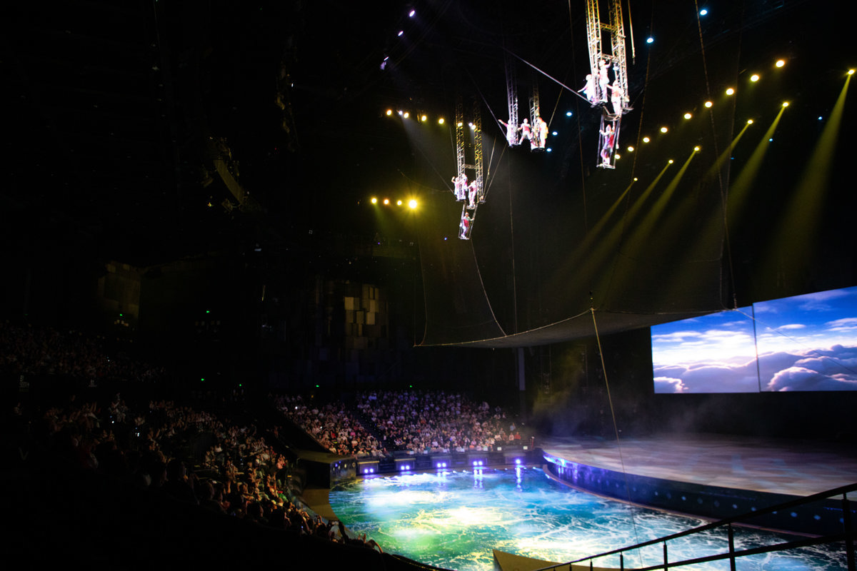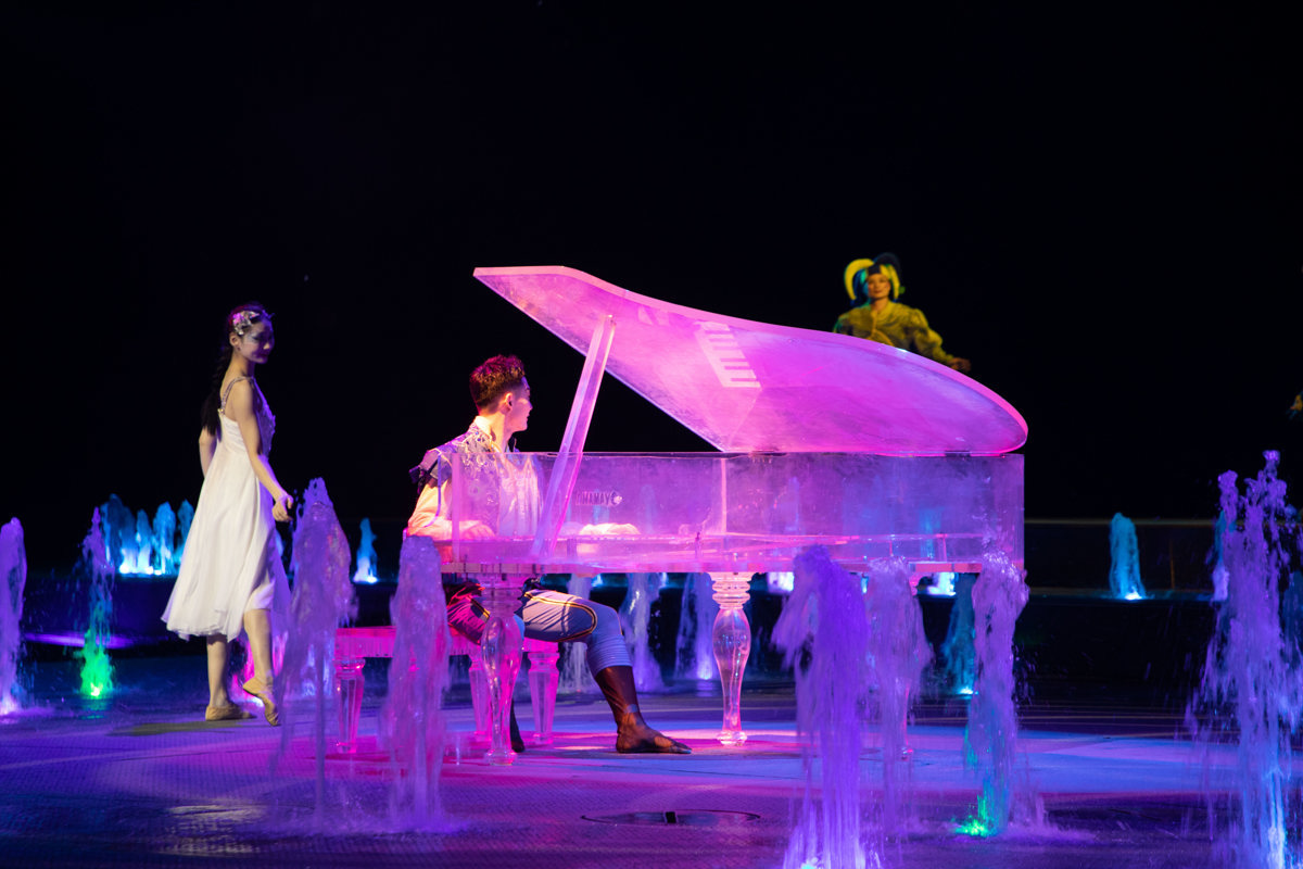 晚上8点演出正式开始,随着灯光渐暗,20米高的绚丽水幕自舞台中央缓缓升起,演员们从高空一跃入水,惊险的特技瞬间点燃全场,观众席里爆发出阵阵惊叹声。整场演出融合了荆楚文化元素、高空跳水、杂技表演与光影特效,牢牢抓住了所有观众的目光,每到精彩桥段,全场都会不约而同地响起热烈掌声。