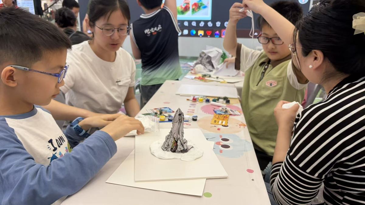 在最受期待的3D地形模型DIY环节,孩子们化身“小小地质工程师”,在家长的协助下,利用黏土、闪粉、小树等材料,亲手打造属于自己的地形模型。从勾勒山脉轮廓、填充海洋地貌,到标注河流、平原、岛屿,孩子们发挥创意与想象力,将课堂上学到的地理知识转化为立体的手工作品。“我要做一个有火山和冰川的地球!”“这里是亚马逊雨林,我要涂上绿色!”孩子们专注投入,家长们耐心指导,亲子间的默契在指尖流转。完成作品后,孩子们纷纷展示自己的“星球模型”,分享创作思路,成就感满满。