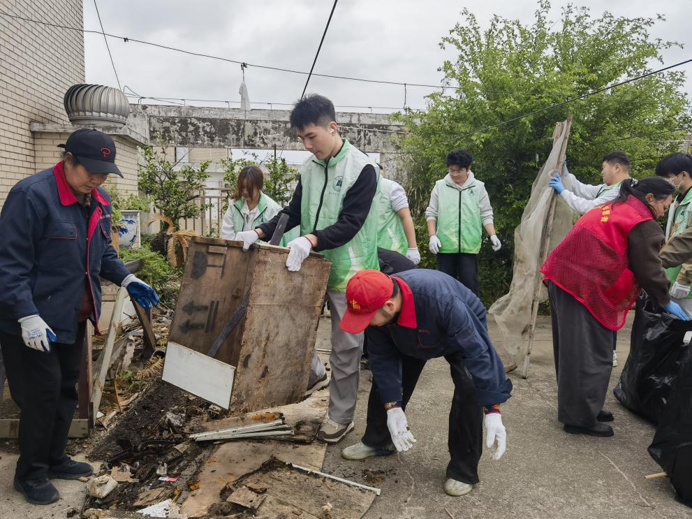 活动现场,工作人员、党员志愿者与湖北大学知行学院青年志愿者们分工协作、干劲十足,形成了热火朝天的劳动场面。大家佩戴好防护手套,针对小区楼顶天台的废弃杂物、闲置破旧木箱、废旧渔网、枯枝杂草、乱堆乱放的闲置花盆与建筑垃圾等卫生死角进行集中清理。志愿者们合力搬运笨重废弃板材、打包清运堆积杂物、规整乱摆盆栽、清扫散落垃圾,将平日里堆积的杂物逐一分拣、打包、清运。大家不怕脏、不怕累,不放过一处死角、不留一处杂物,齐心协力清理陈年堆积物,规整公共区域空间,逐步还原天台整洁开阔的环境。
