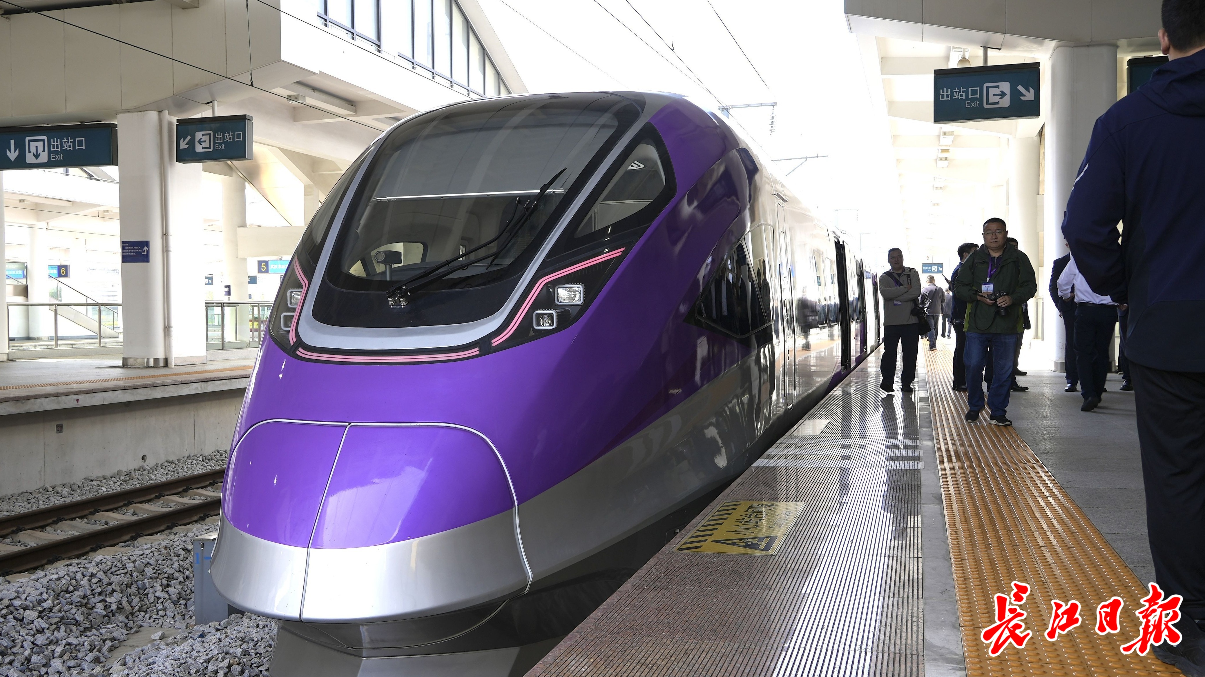 上午9时,长江日报记者来到武汉东站,与100多名乘客共同体验武汉东至咸宁南S8588试乘体验车次。步入站台,智能城际列车通体银紫涂装看起来十分炫酷,过去常被网友称作“紫茄子”,有着“紫气东来、祥瑞如意”的美好寓意。