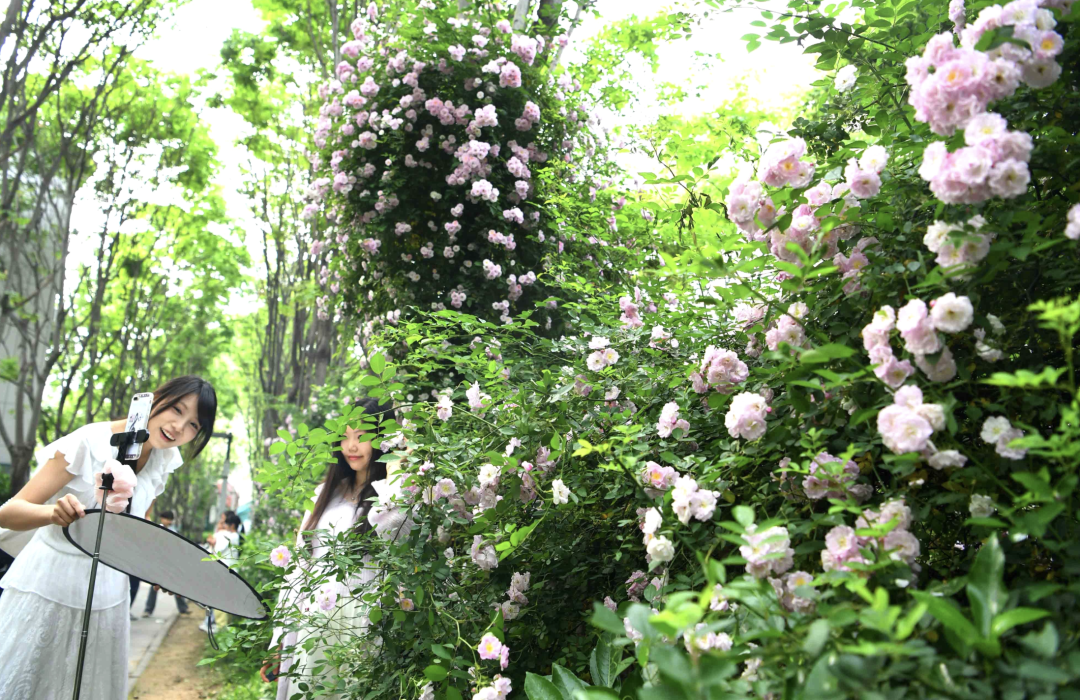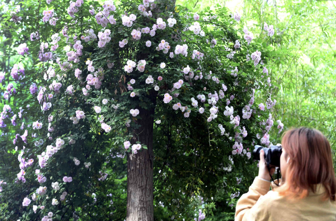 这个周末,武昌八一路珞珈山公交车站被粉白相间的蔷薇花装点得如梦似幻,吸引游客与学子驻足拍照。记者高勇 摄