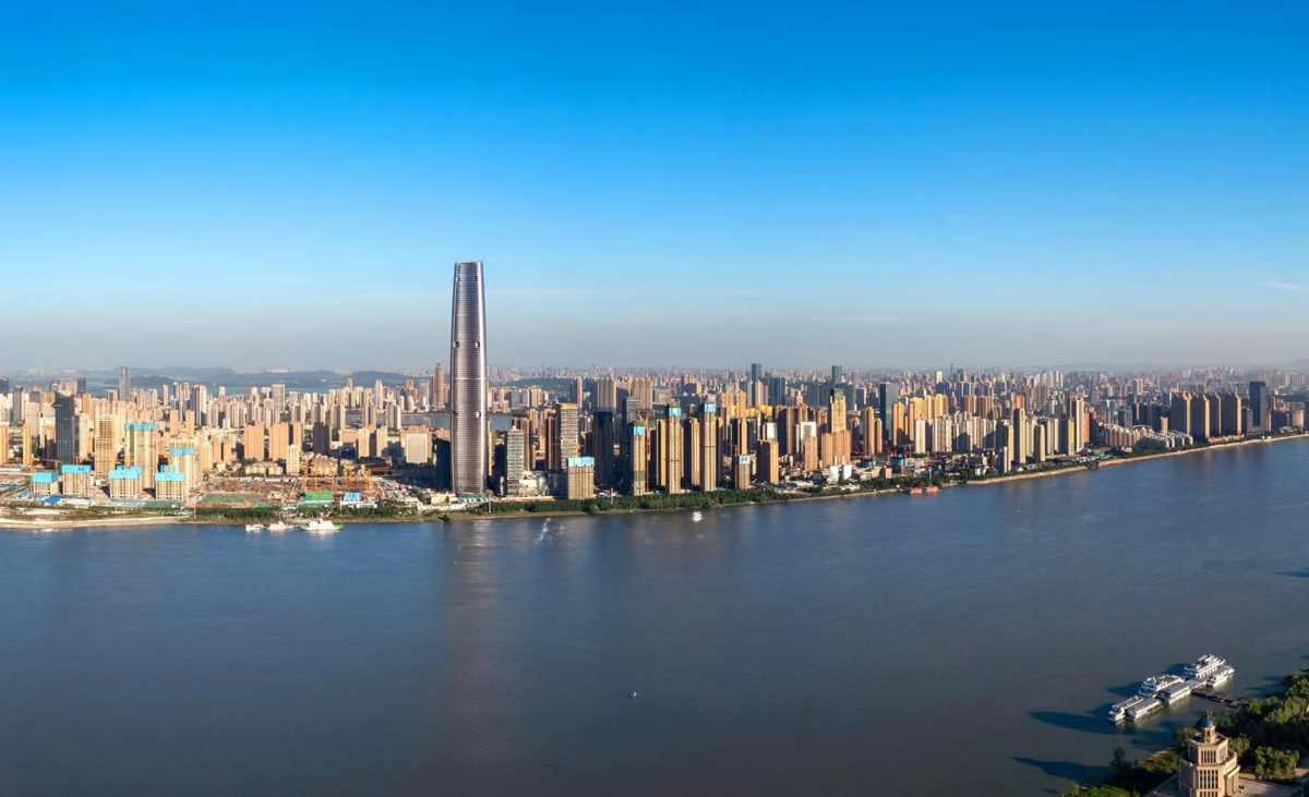 华中第一高楼武汉绿地中心,屹立长江右岸之滨,约500米建筑高耸入云,一面是浩荡长江绿色生态,一面是摩天楼宇宛若“垂直城市”带来的多元产业,武汉绿地中心成为世界看武汉的第一眼。