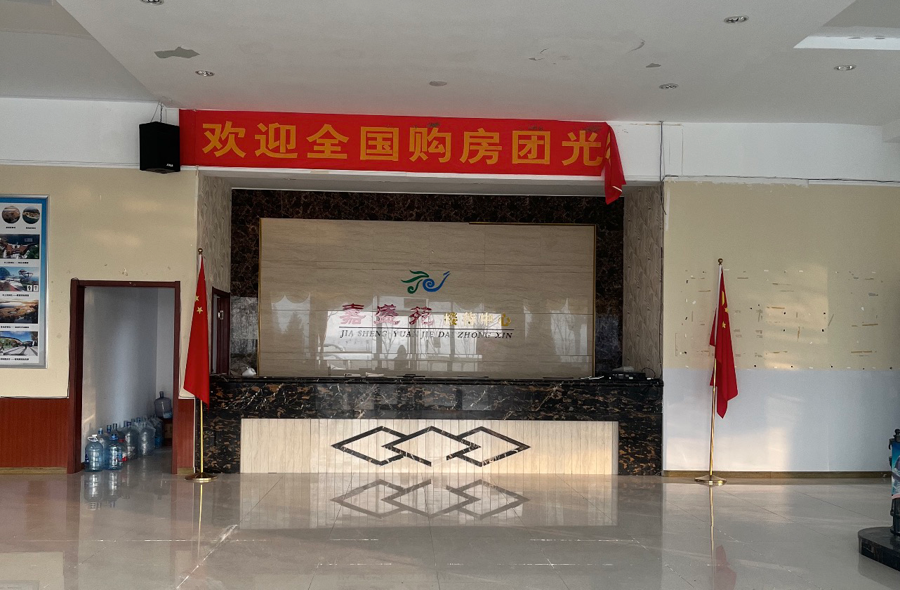 银滩一售楼处悬挂着“欢迎全国购房团光临”的横幅,时代周报记者摄