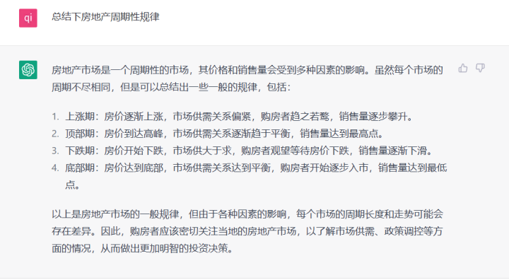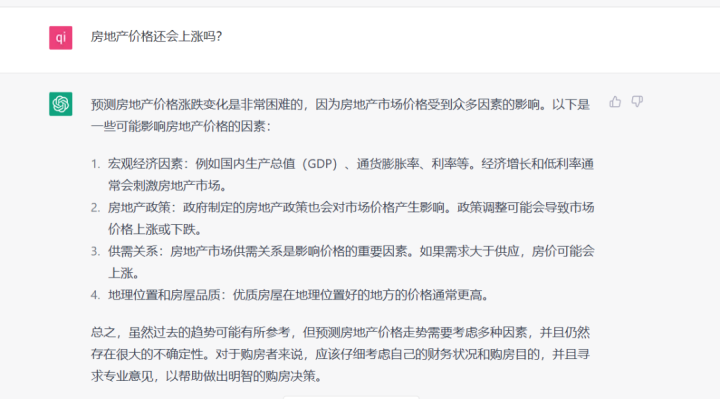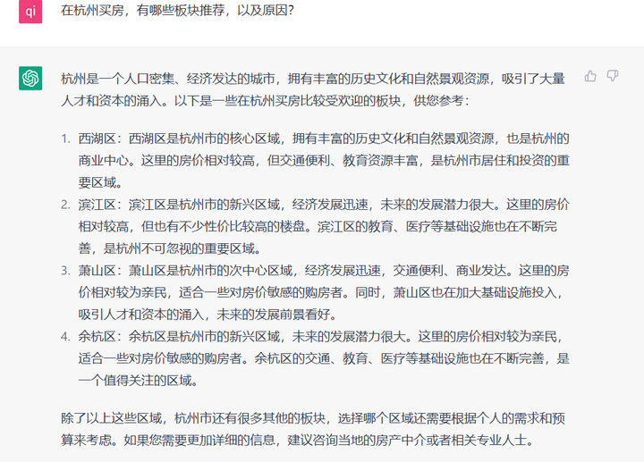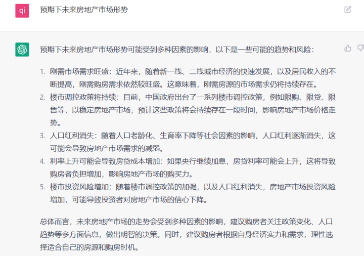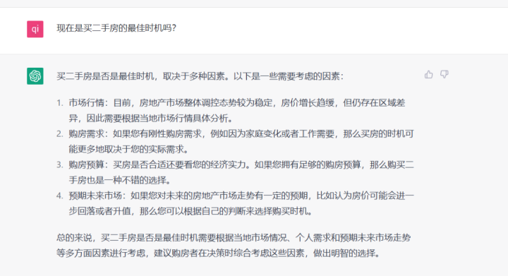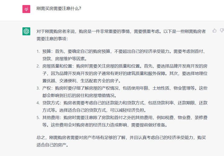 总体而言,根据ChatGPT对于提出的几个问题的回答来看,它条理清晰但比较中规中矩,能给购房者提供比较客观性的建议,更多的需要购房者们自身的主观判断。