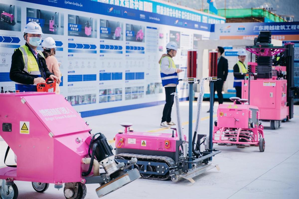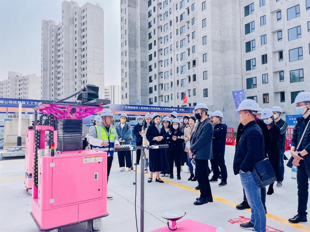 本次媒体行参观的第三站是崇文棠项目智慧建造工地。现场一共展出了地库抹光、地坪研磨、天花打磨、内墙打磨、混凝土抹平、r400地坪研磨六款工地机器人。