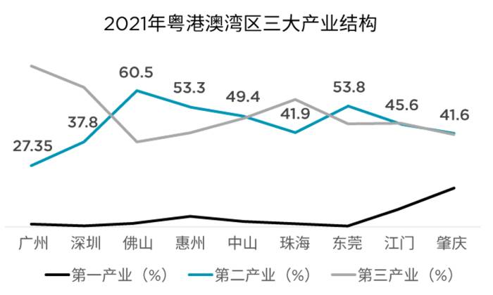 戴德梁行指出,在大湾区核心9大城市的产业结构中,第二产业保持高比例运行。其中,深圳、东莞和佛山的地位尤为突出。而湾区将延续产业体系完备、基础扎实、关联性和耦合度较强等优势,在未来保持制造业在GDP中的较大占比。