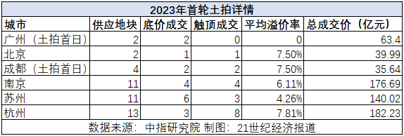 苏州于2月23日举行的2023年首轮土拍中,11宗地块有5宗溢价成交,3宗触及地价上限,土地成交总价140亿元,平均溢价率7.46%。