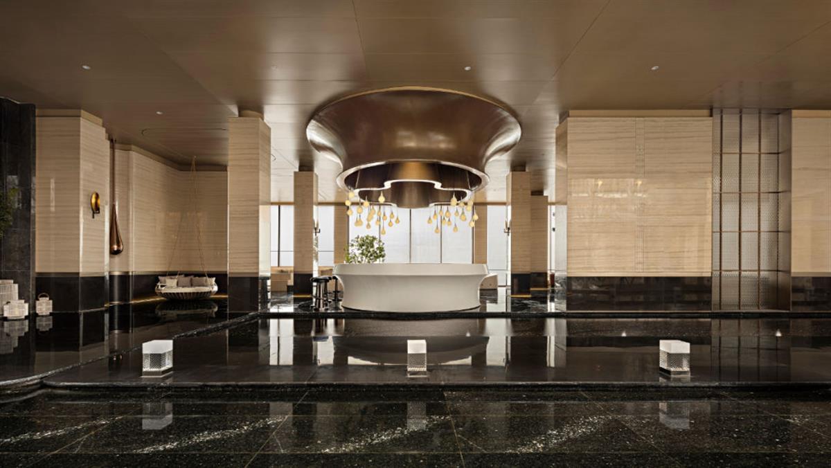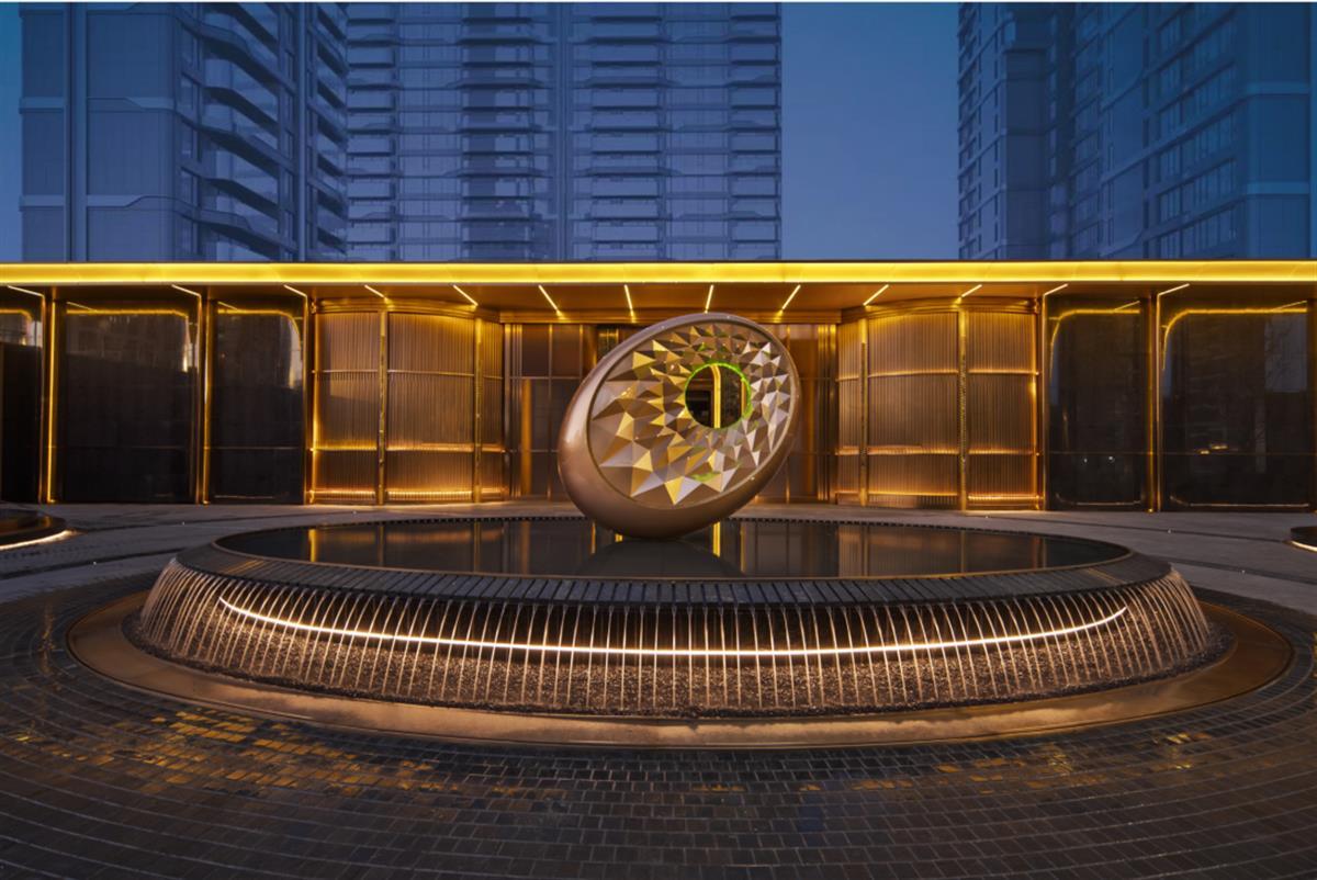 弧线曲面建筑外立面,约64米的巨幅金色拱形艺术门厅,给予了观众第一眼的视觉冲击。