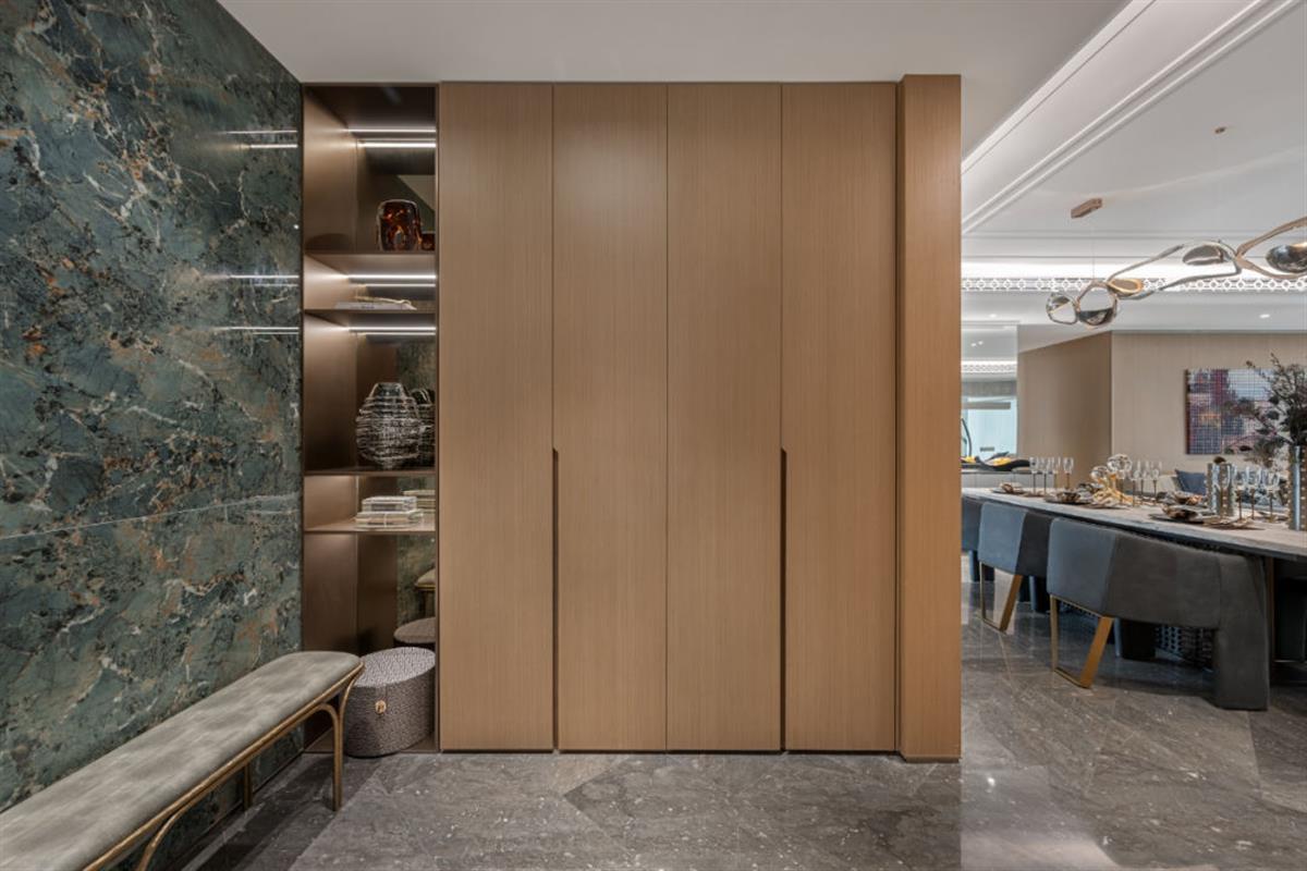 还有玄关处的定制孔雀绿岩板,漆皮木饰墙面,精工细致的透光展示柜、香槟灰收纳柜以及无处不在的PRADA绿、亚马逊绿奢石……
