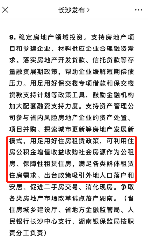 今年2月6日,在湖南省人民政府召开的发布会上,提出“稳增长20条”。在稳定房地产领域投资里面提出:可利用住房公积金增值收益收购社会房源作为公租房、保障性租赁住房,满足各类群体租赁住房需求。