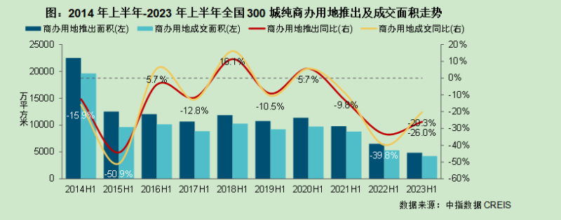 在土地市场方面,今年上半年,地方政府供地延续谨慎态度,房企拿地也较为理性,全国300城纯商办用地推出及成交规划建筑面积同比降幅均在20%以上,供需规模均继续探底。其中,一线城市因上年同期基数较低,纯商办用地成交面积有所增长,但二线城市及三四线城市纯商办用地成交缩量态势未改。