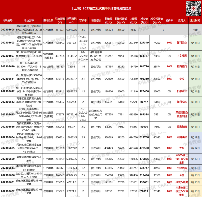 三天内,上海15宗宅地全部完成出让,平均溢价率7.82%。