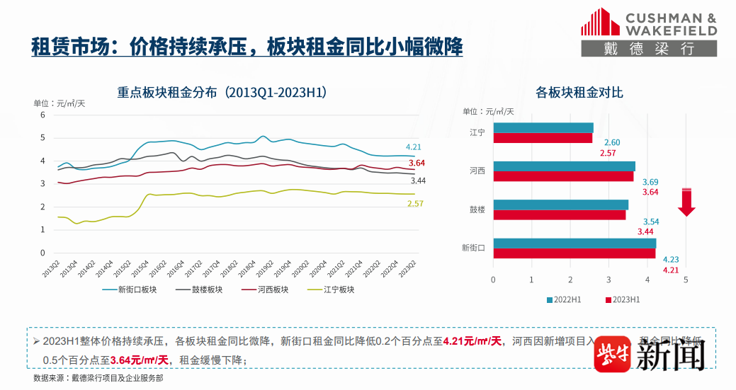 扬子晚报网7月21日讯(记者马祚波)来自国际知名地产机构戴德梁行的今年二季度市场报告显示,南京甲级写字楼的平均租金价格基本保持平稳,目前市场租金为83.1元每月每平方米。
