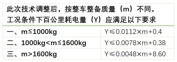 第三个指标为“按整车整备质量(m)不同,工况条件下百公里耗电量(Y)应满足要求”,此次技术调整将该指标分为三种详细情况: