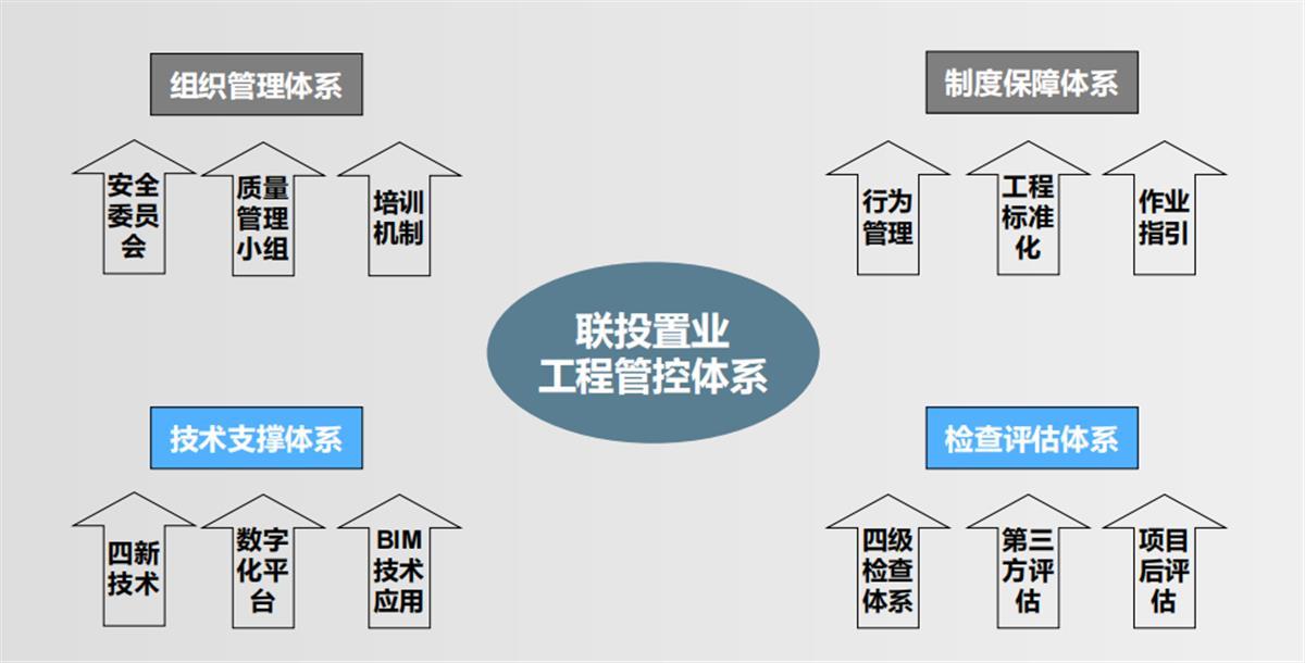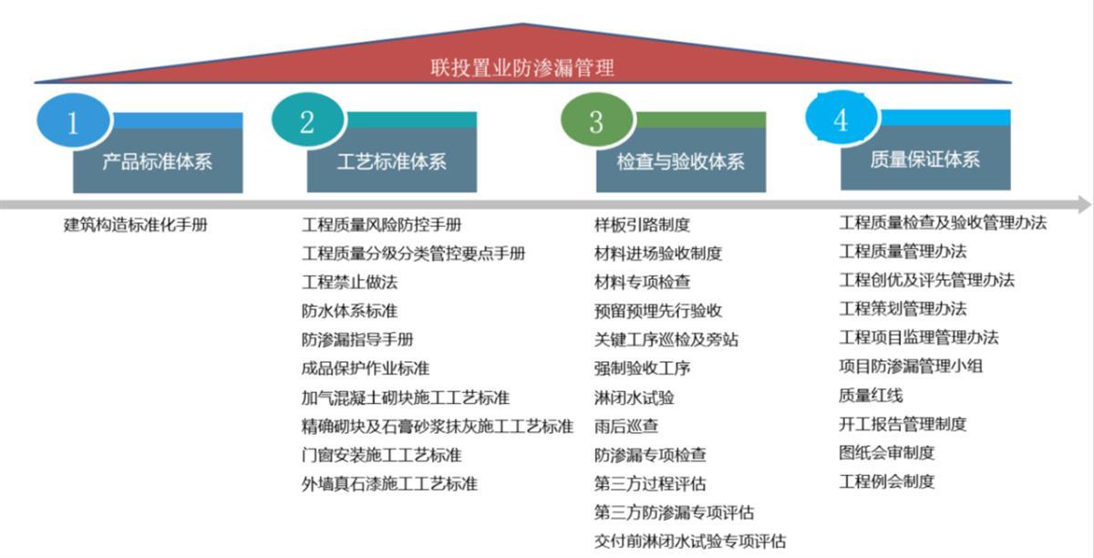 联投置业强化项目施工精细化管理,采用BIM、装配式、智能家居等新型技术,总结项目质量优秀经验做法,加强工程质量事中事后监管。从招标、设计、施工、交付四个阶段建立全系统全生命周期的防渗漏管理体系,将防漏漏管控动作标准化、程序化,坚持凡检查评估必“下单”整改、凡整改必督办销项。