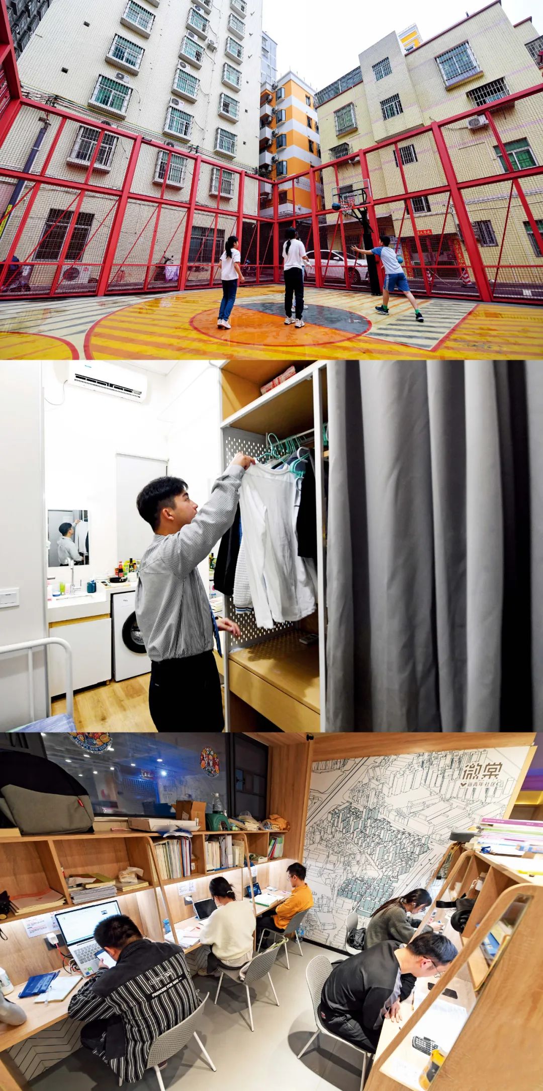 上图:4月2日,在广东深圳市龙华区元芬村,居民在增设的篮球场打篮球。中图:元芬村的一间青年公寓内,租户张毅掾整理衣橱。下图:元芬村青年公寓住户在社区增设的自习室工作学习。图/新华