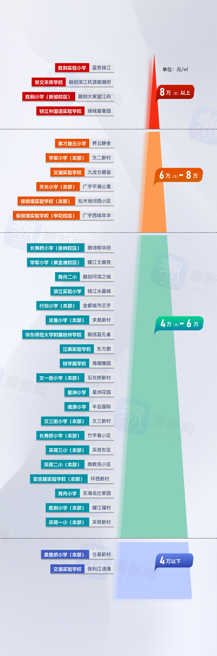 如今,这些学区房价格全都掉队。如学军小学本部的学区房求智巷小区,成交均价6.5万元/㎡;保俶塔实验学校本部的学区房松木场河西,成交均价6万元/㎡;采荷二小的学区房商教苑小区成交均价4.2万元/㎡,曾经被炒得最凶的“孟母盘”文鼎苑,如今成交价基本在价6万元/㎡以内。
