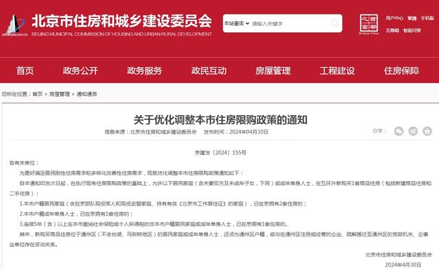 北京市住房和城乡建设委员会于4月30日发布《关于优化调整本市住房限购政策的通知》。自该通知印发次日起,在执行现有住房限购政策的基础上,符合相应条件居民家庭(含夫妻双方及未成年子女)或成年单身人士,可在北京五环外新购买1套商品住房(包括新建商品住房和二手住房)。