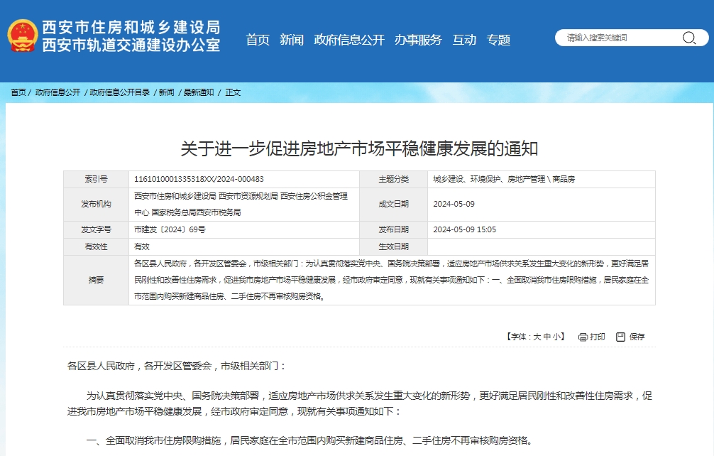 同样在9日,西安市住房和城乡建设局等4部门联合发布《关于进一步促进房地产市场平稳健康发展的通知》,共计10条措施来促进房地产市场平稳健康发展。西安新政明确指出:“全面取消我市住房限购措施,居民家庭在全市范围内购买新建商品住房、二手住房不再审核购房资格。”