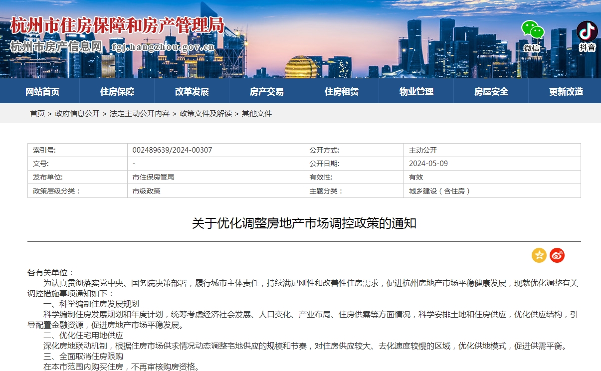 9日,杭州市房地产市场平稳健康发展领导小组办公室发布的《关于优化调整房地产市场调控政策的通知》明确,在本市范围内购买住房,不再审核购房资格。这也就意味着,历时8年的杭州楼市限购政策,终于全面取消。