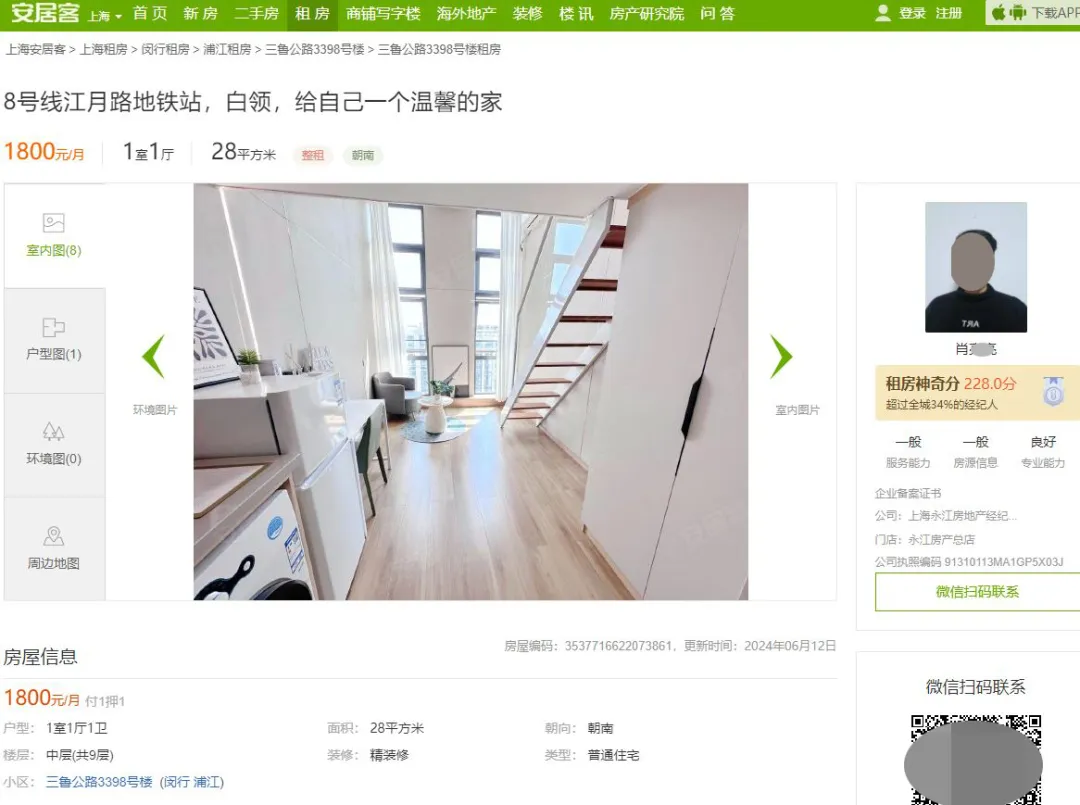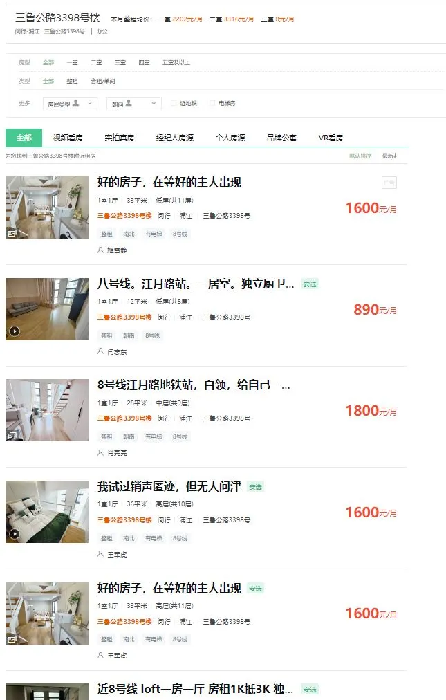 6月初,在上海上大学的小唐即将毕业离开校园,她得赶快找个房子搬出校园住。考虑到在浦江镇实习,她想就近租个房子,便在租房平台“安居客”上搜索相关房源。“8号线江月路地铁站”“一室一厅28平方米”……比选后,她选中一套1800元每月的房源,网页显示房源地址位于“三鲁公路3398号”,是精装修的“普通住宅”,由名为“永江房地产”的中介上架。