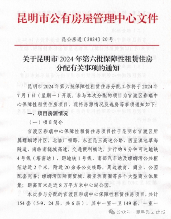 7月1日,昆明市住房和城乡建设局发布《关于昆明市2024年第六批保障性租赁住房分配有关事项的通知》,将对官渡区彩瑞中心项目的154套保障性租赁住房进行分配。