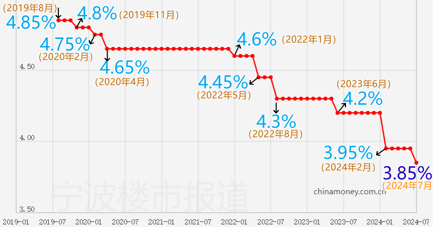 其中,作为房贷利率参照的5年期以上LPR,继今年2月以史上最大幅度调降25个基点后(从4.2%降至3.95%),今天再次下调10个基点,最新的5年期以上LPR来到了3.85%。