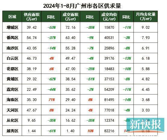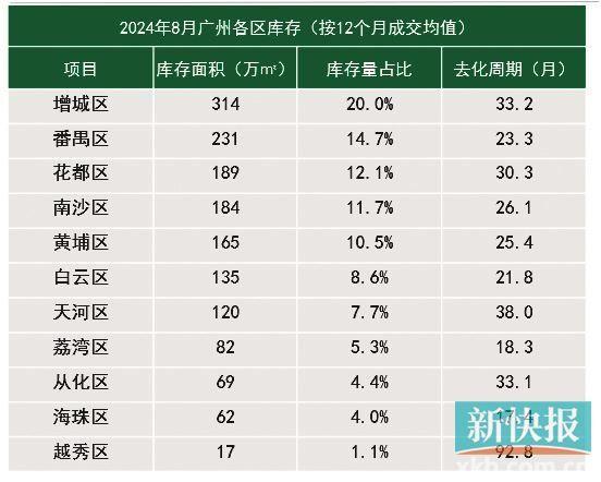 与缓慢的去化相对应的,是大批的新房库存。崔登科告诉新快报记者,根据世联东一研究院监测,目前广州市11区的平均去化周期为23个月左右,是正常去化周期的两倍,比去年高出5个月左右。而记者查阅11区数据发现,去化周期超过30个月的区有5个,其中两个更来自中心六区。克而瑞广佛数据显示,截至2024年8月,越秀、天河、增城、从化、花都的去化周期分别为92.8、38、33.2、33.1、30.3个月。在中心六区中,海珠、荔湾去化周期较为健康,分别为17.4个月和18.3个月。