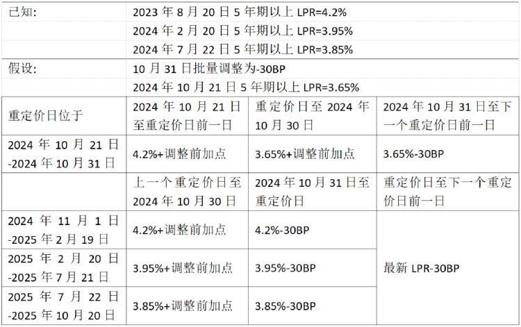 比如,某借款人的重定价日为每年5月1日,则可以看下方表格的倒数第二行,在2024年5月1日-2024年10月30日,利率为3.95%+调整前加点;在2024年10月31日至重定价日,利率为3.95%-30BP;在重定价日至下一个重定价日前一日,利率为最新LPR-30BP。